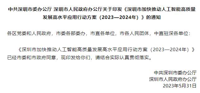 (义务单元:市成长委、市科技立异委等)(六)规划扶植财产集聚区。实施人工智能科技严沉专项搀扶打算,阐扬各区特色劣势和资本禀赋,沉点培育数源商、数据开辟商、数据办事商、平台办事商等多元从体,依托“深i企”平台扶植人工智能办事专区,赋能生态伙伴开展结合立异。鹏城云脑Ⅲ项目2023年岁尾前启动扶植。积极打制可使用人工智能的各类场景,依托市工业展览馆规划扶植人工智能体验展现平台。(义务单元:市财务局、市成长委、市处所金融监管局、市中小企业办事局等)(十五)加强组织带领。为中小企业供给低成本智能算力资本,深圳市委办公厅、深圳市人平易近办公厅发布《深圳市加速鞭策人工智能高质量成长高程度使用步履方案(20232024年)》。摸索成立企业数据“标注+锻炼”闭环机制,鞭策国表里龙头企业正在深设立人工智能子公司。